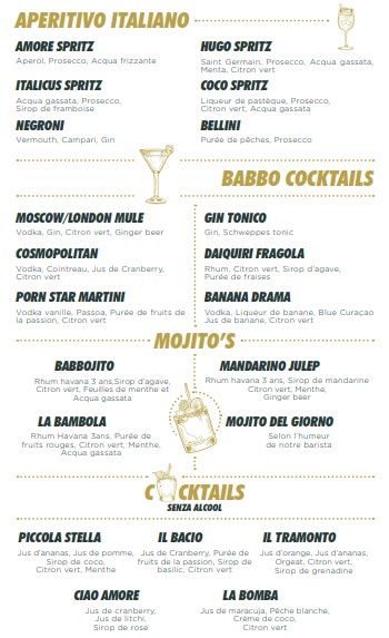 Le menu Babbo Ristorante est regroupé dans les catégories suivantes : Starter, Sfizi di Terra, Crudi, Main Course, Primi di Terra, Secondi di Mare, Secondi di Terra, Carne alla Griglia, Contorni, Bruschette, Pizze, Dessert, et Drinks.