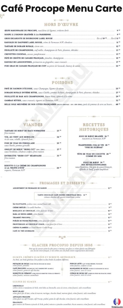 Le menu du Café Procope à Paris est regroupé dans les catégories suivantes : Entrées, Poissons, Viandes, Recettes historiques, Grandes Assiettes, Fromages & Desserts, GLACIER PROCOPIO DEPUIS 1686, MENU PROCOPE, Menu Philosophe, Carte des Vins, Carte des Vins, Carte des Boissons, Spiritueux, Digestifs, Salon de café, Pause Gourmande, CRÈMES GLACÉES & SORBETS ARTISANAUX, COUPES DE GLACES, À LA TASSE, CAFÉ DES RÉVOLUTIONNAIRES, THÉS & INFUSIONS, CHOCOLATS CHAUDS, COCKTAILS CRÉATIONS, COCKTAILS CHAUDS, et PROCOPE LIQUORISTE.