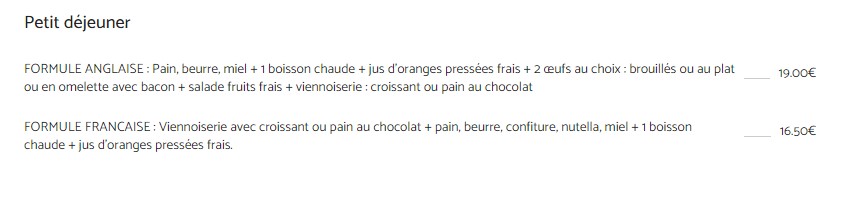 Pain, beurre, miel + 1 boisson chaude + jus d’oranges pressées frais + 2 œufs au choix (brouillés, au plat, ou en omelette avec bacon) + salade fruits frais + viennoiserie (croissant ou pain au chocolat)