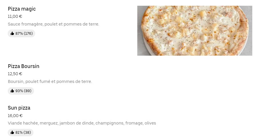 Les choix de menu végétariens incluent la Salade César de la section Salades, qui est une salade César. En outre, plusieurs pizzas végétariennes sont proposées, telles que la Pizza Buffalo, la Pizza Reine, la Pizza 4 fromages, la Pizza marguerita, la Pizza paysanne, et d’autres encore, répertoriées dans les catégories Pizzas Base Tomate, Pizzas Base Crème Fraîche, et Pizzas Spéciales.