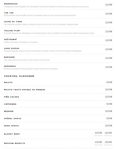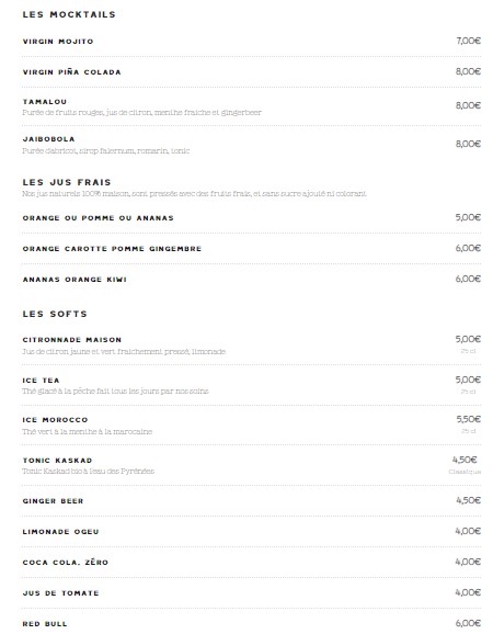 Le menu de Monsieur Mouette est regroupé dans les catégories suivantes : A La Carte, Cocktails, Vins, Champagnes, Bières, Apéritifs, Digestifs, Alcools, Spiritueux, Moctails, Jus Frais, Softs, et Boissons Chaudes.