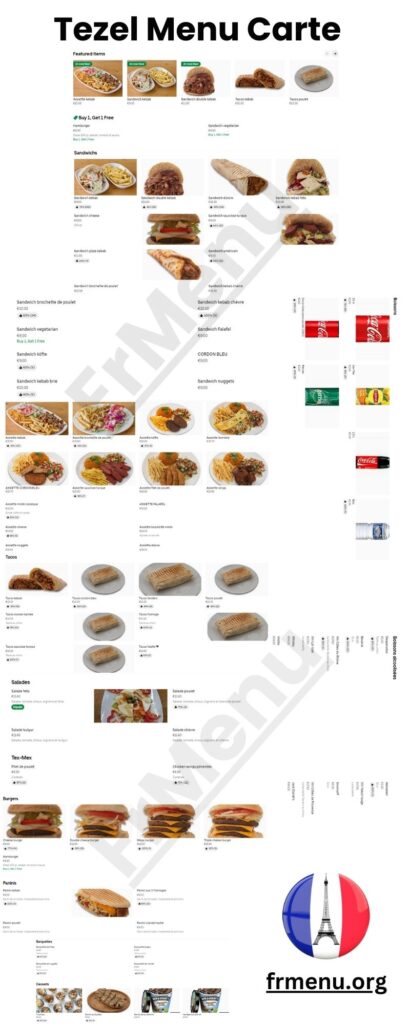 Le menu Tezel est regroupé dans les catégories suivantes : Meilleurs choix, Sandwichs, Assiettes, Tacos, Salades, Tex-Mex, Burgers, Paninis, Barquettes, Desserts, Boissons, et Boissons alcoolisées.